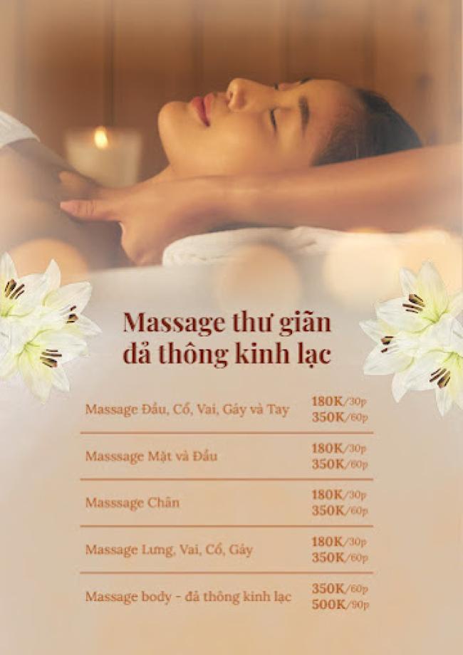 - Massage tinh dầu : là liệu pháp kết hợp giữa những kỹ thuật massage như đuổi miết, xoáy tròn, lực đầm, vuốt đuổi cùng hương thơm tinh dầu mang đén cho khách hàng sự thư giãn