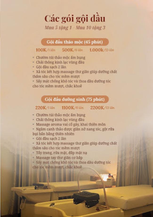 - Gội đầu dưỡng sinh:là chăm sóc tóc và da đầu một cách đặc biệt, kết hợp với việc massage vùng đầu, vai gáy, cổ, lưng,…làm sạch da đầu và tóc với các dầu gội thảo dược từ thiên nhiên như sả, bồ kết, vỏ bưởi, quế,…